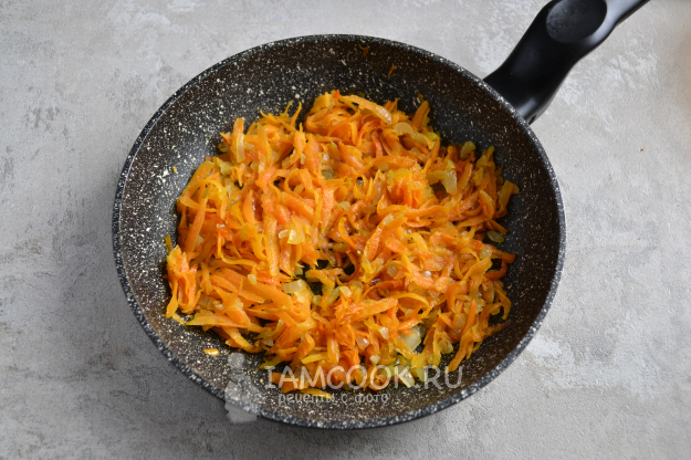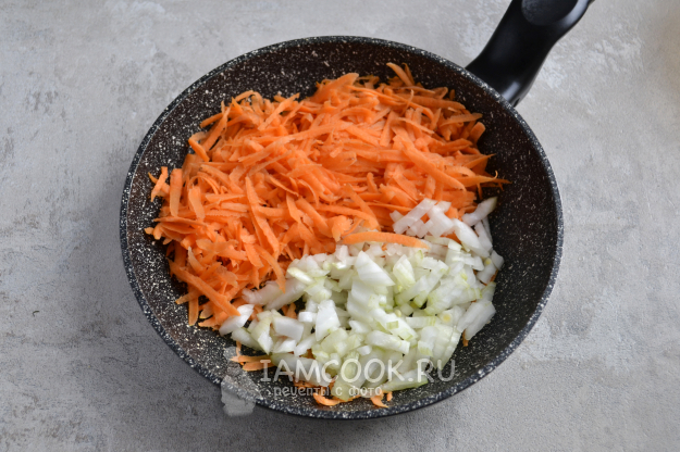 Морковь очистите и натрите на крупной терке. Лук очистите и мелко нарежьте. Разогрейте сковороду с растительным маслом и положите лук и морковь.