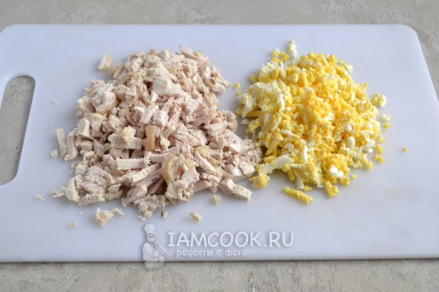 Вареную куриную грудку мелко нарежьте поперек волокон. Яйца отварите вкрутую, охладите, очистите и натрите на средней терке.