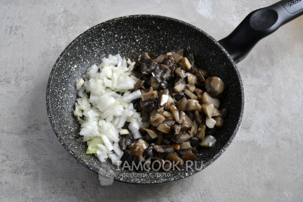 Вареные лесные грибы мелко нарежьте, лук нарежьте так же. Разогрейте сковороду с растительным маслом и положите на нее грибы и лук.