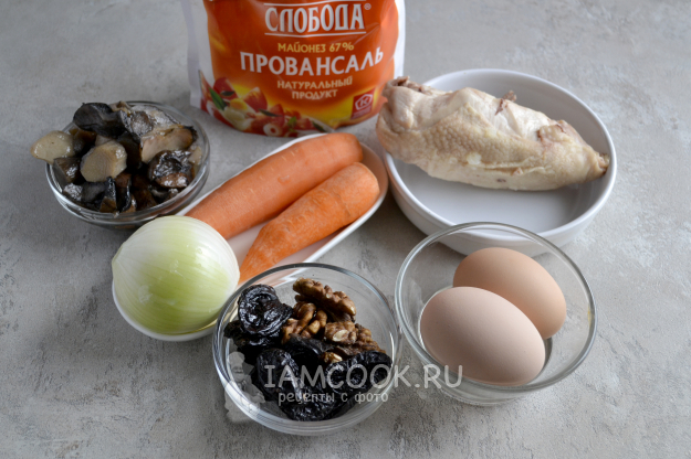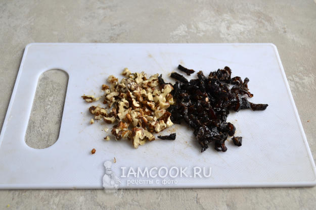 Вымойте чернослив и грецкие орехи. Если необходимо, то залейте чернослив на 10 минут холодной водой, затем воду слейте, чернослив обсушите и мелко нарежьте. Орехи порубите ножом до мелкой крошки.