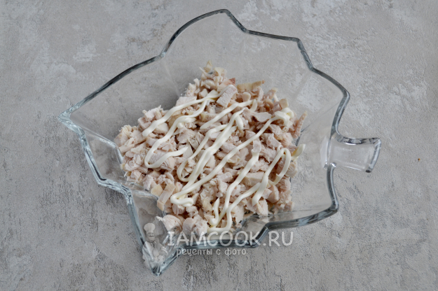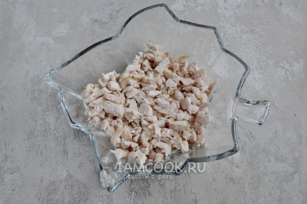 В салатник первым слоем положите куриную грудку.