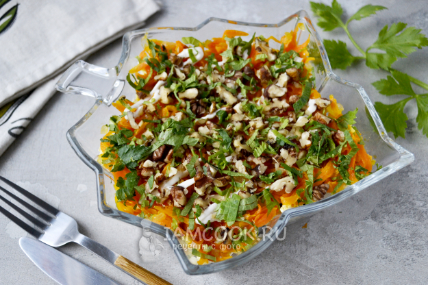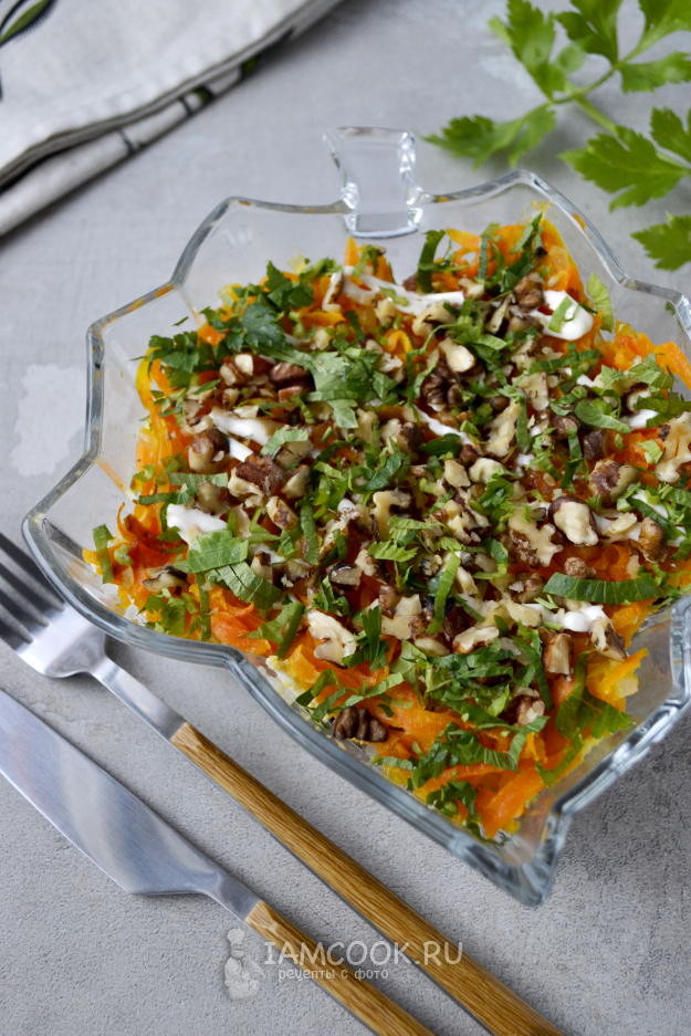 Морковь посыпьте грецким орехом и по желанию мелко нарезанной свежей зеленью. Можно обойтись и без нее.