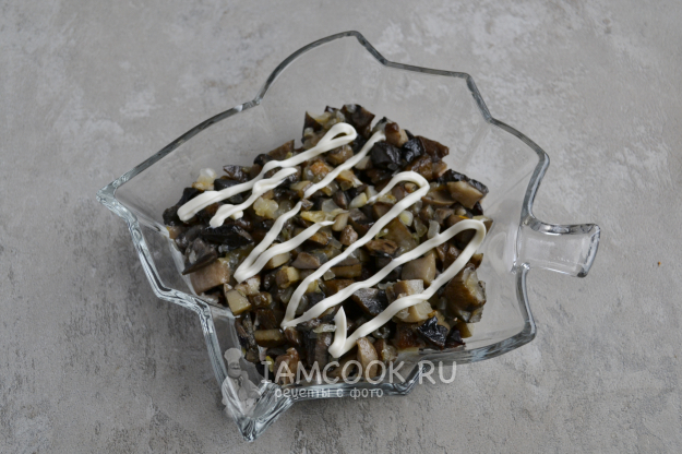 Третий слой - остывшие грибы с луком. Сеточка из майонеза.