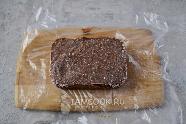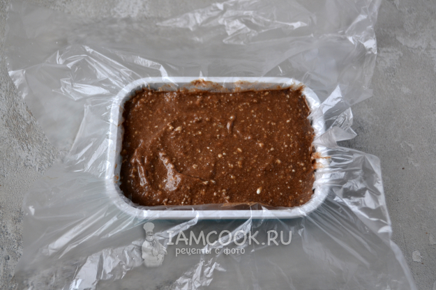 Невысокий контейнер застелите пищевой пленкой и выложите шоколадно-банановую массу. Контейнер поставьте в морозильную камеру для застывания.