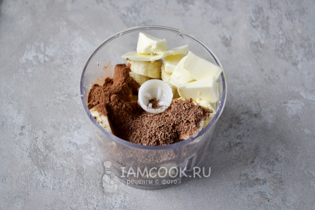 Добавьте мягкое сливочное масло, какао-порошок и натертый шоколад. Шоколад можно растопить и добавить в жидком виде в чашу блендера.