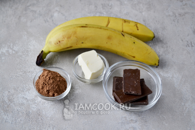 Возьмите продукты для приготовления шоколадно-бананового фаджа: спелые бананы, сливочное масло, какао-порошок и шоколад с содержанием какао 70%.