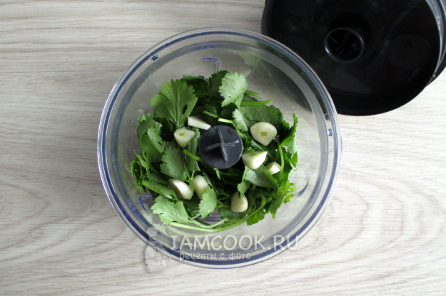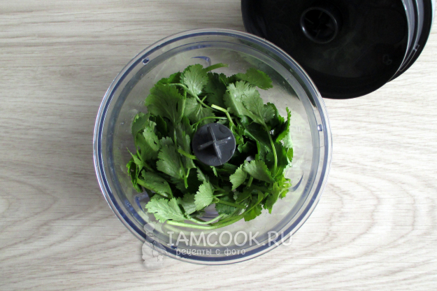 Возьмите пучок кинзы, ополосните его в холодной воде, удалите грубые стебли. Поместите в чашу блендера (или в ступку). Влейте немного воды.