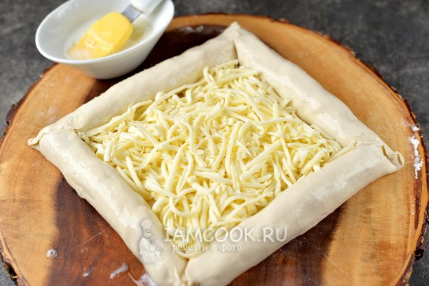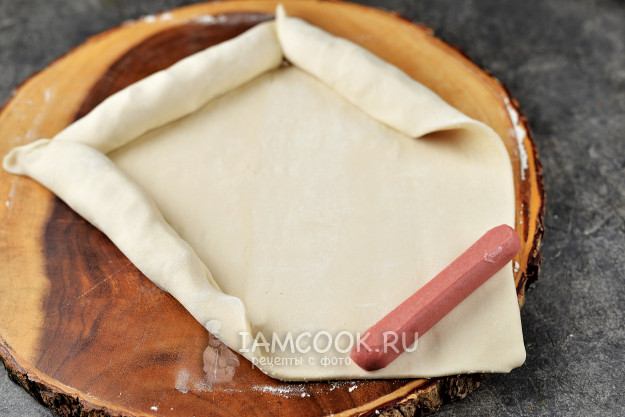 Слегка посыпьте поверхность мукой, положите на нее квадратный лист теста, слегка раскатайте его. На каждый угол положите по сосиске, заверните их в тесто так, как показано на фото, углы защипните.