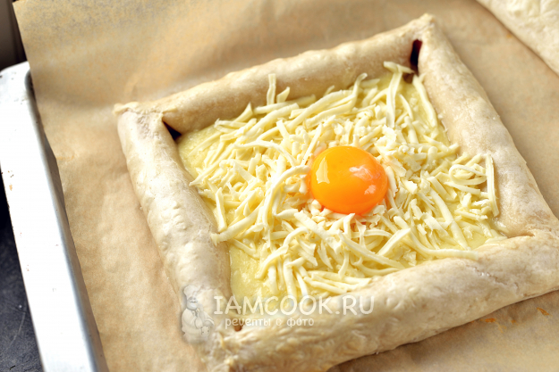 Извлеките хачапури из духовки, посыпьте оставшимся сыром, положите желток и верните обратно в духовку еще на 5-7 минут.