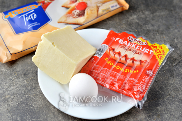 Возьмите все продукты для приготовления хачапури с сосиской и яйцом.