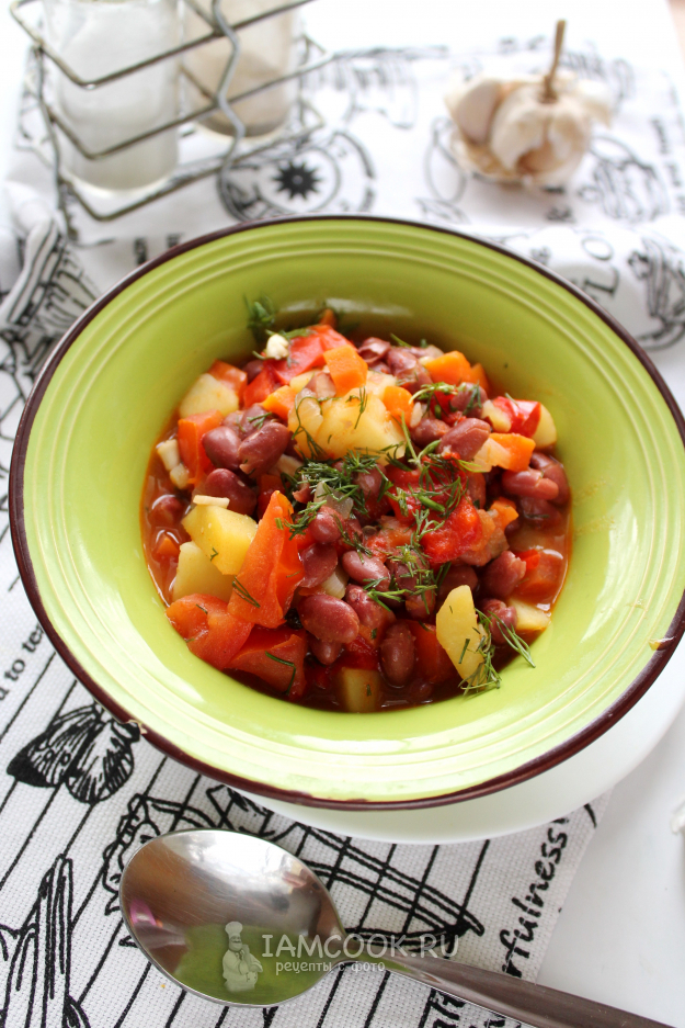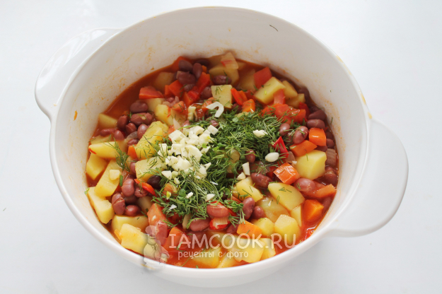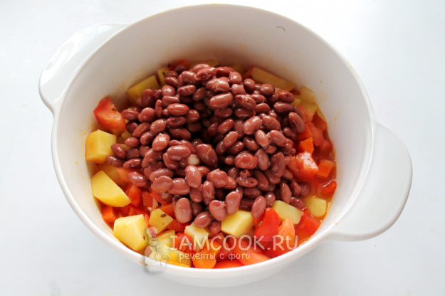 И закладываем главный ингредиент - отваренную (или консервированную) фасоль. Солим по вкусу.