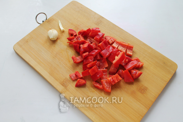 Для яркости цвета возьмем красный болгарский перец, его очистим от семян и тоже порежем кубиком или брусочками. Раздавим зубчик чеснока, удалим сердцевину.