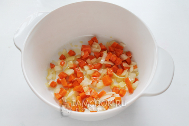Мелким кубиком порежем репчатый лук и морковь, припустим их на подсолнечном масле.