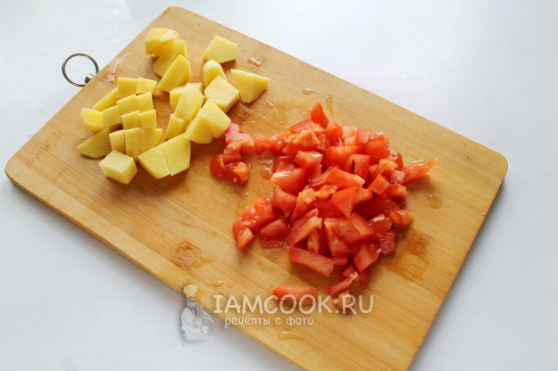 Брусочками покрупнее нарезаем картофель. Помидор тоже подвергнем аналогичной нарезке.