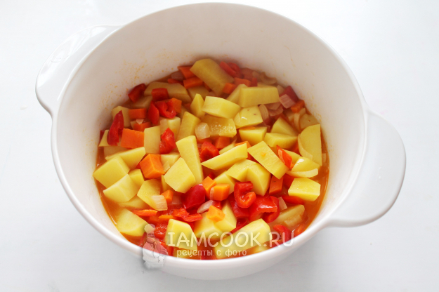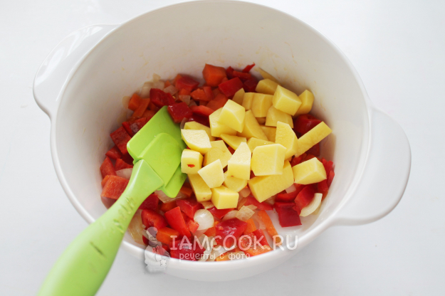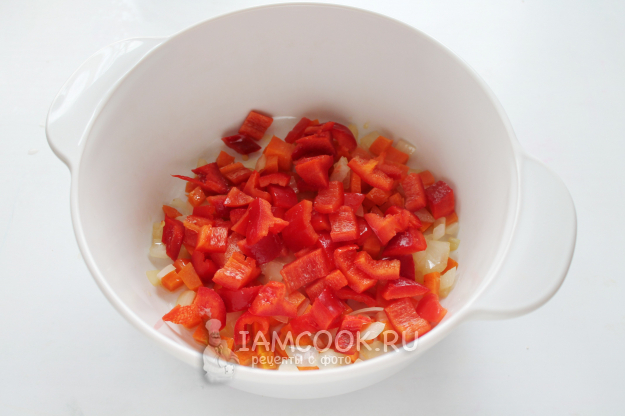 Перец отправляем в сотейник к луку с морковью, тоже немного томим.