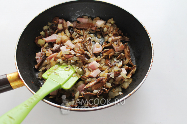 Грудинку добавим в сковороду и немного обжарим-потомим. Вот наша первая заправка готова.