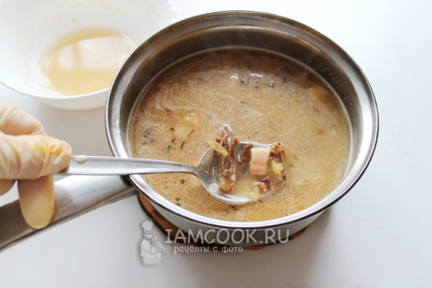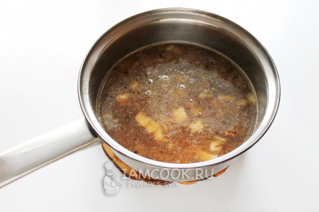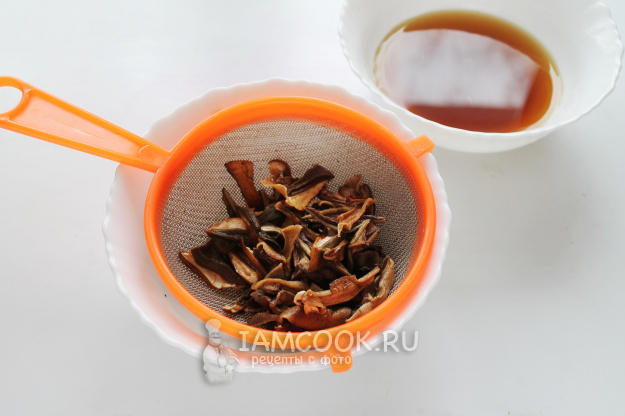 Затем грибы аккуратно процедим, а воду используем в дальнейшем для приготовления супа.
