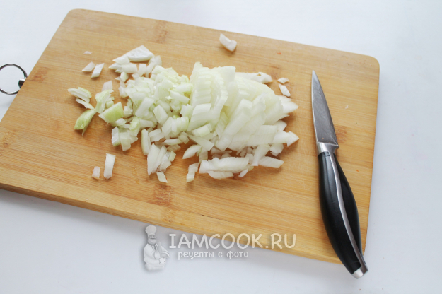 Теперь настала очередь приготовления суповой заправки №1: очистим и мелко порежем луковицу.