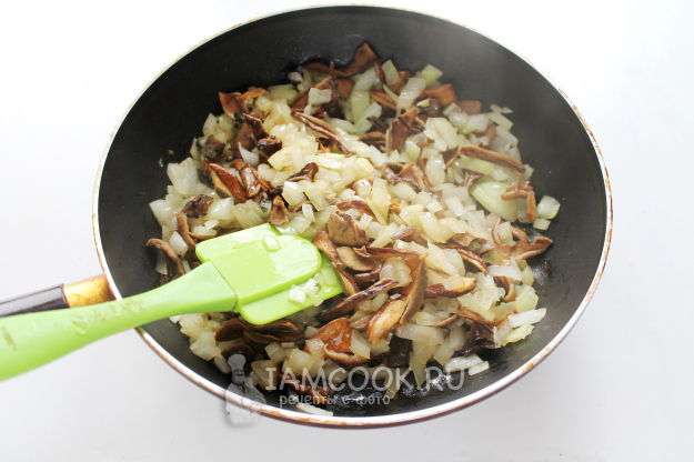Разогреем сковороду со смесью масел и обжарим лук, а затем добавим грибы и 2-3 столовых ложки бульона. Тушим на медленном огне до мягкости грибов.