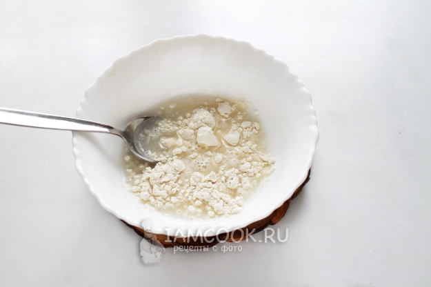 Теперь настала очередь второй заправки - мучной. Отдельно холодной водой разведем муку, перемешаем до исчезновения комочков.