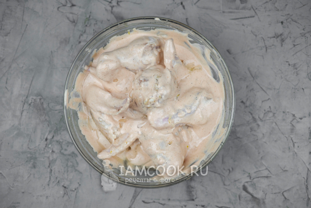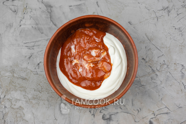Эту сметанно-томатную смесь выложим к крылышкам, перемешаем хорошенько и оставим еще на 30 минут в покое.