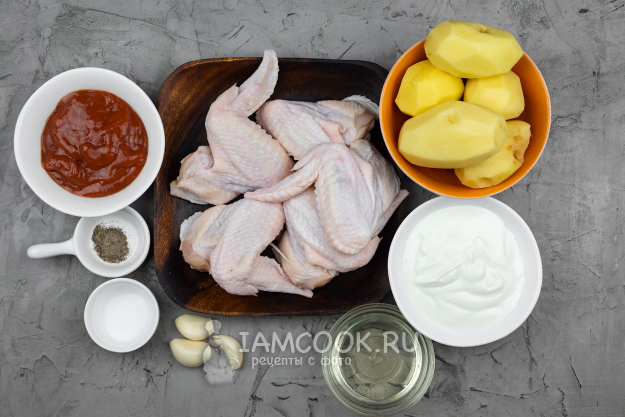 Возьмите необходимые ингредиенты для приготовления куриных крылышек с картошкой в мультиварке. Почистим картофель и помоем в теплой воде, крылышки промоем в проточной воде. Почистим чеснок.