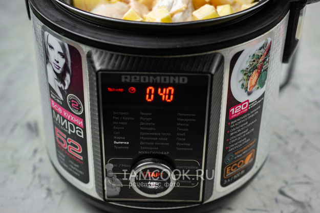 Запустим на выполнение программу "Выпечка" на 40 минут. В процессе запекания куриных крылышек с картошкой в мультиварке можно пару раз помешать содержимое чаши ложкой.