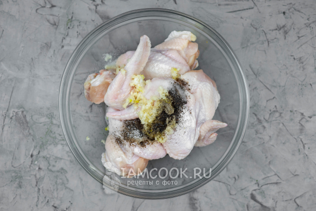 В просторную миску выложим все куриные крылышки. Зальем к ним растительное масло, выдавим через пресс чеснок, добавим соль, черный молотый перец.