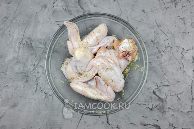 Перемешаем крылышки так, чтобы специи и масло по возможности равномерно распределились. Оставим в покое крылышки примерно на час.