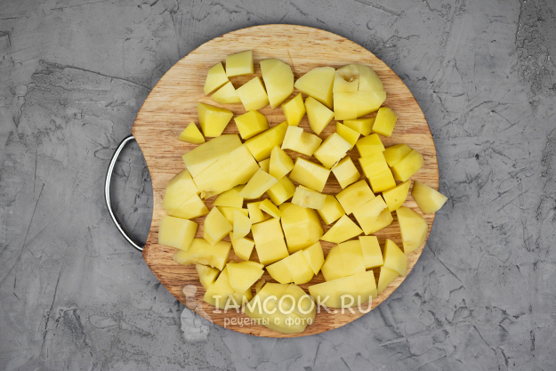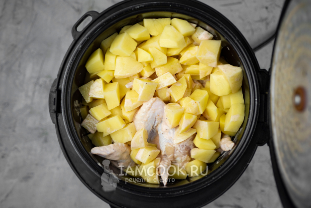 В чашу мультиварки выложим крылышки в сметанно-томатном соусе, сверху выложим картофель и перемешаем.