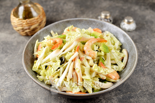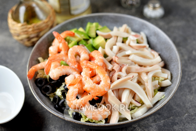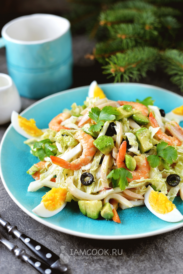 Салат с креветками, кальмарами и авокадо можно приготовить заранее, а заправить и перемешать прямо на праздничном столе.