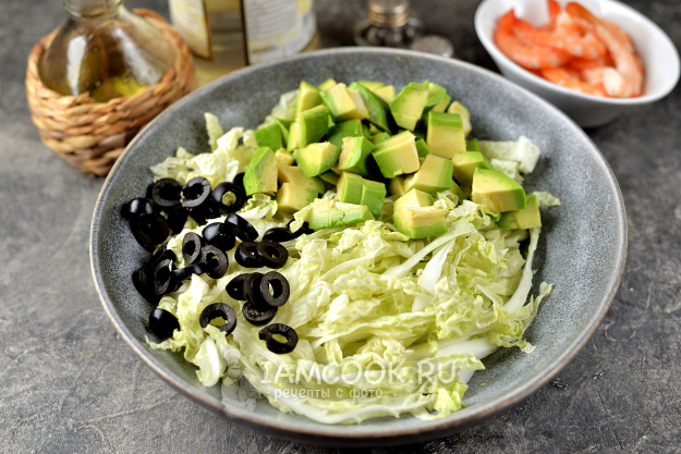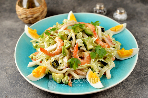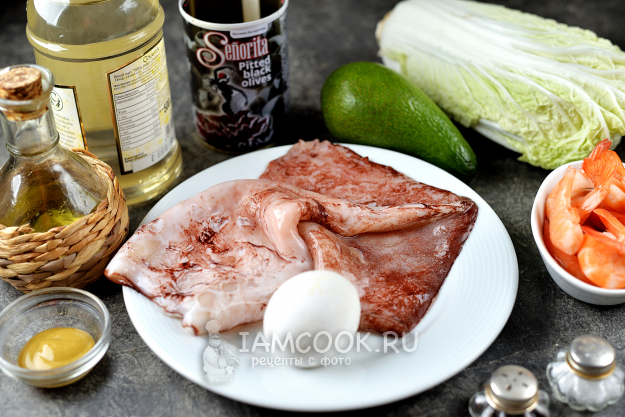 Возьмите все необходимые продукты для салата с креветками, кальмарами и авокадо. Хвосты креветок и тушку кальмара предварительно разморозьте. Помойте и обсушите пекинку с авокадо.