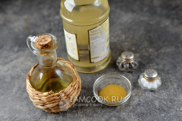 Смешайте в небольшой емкости оливковое масло, винный уксус, горчицу, соль и перец до однородности.