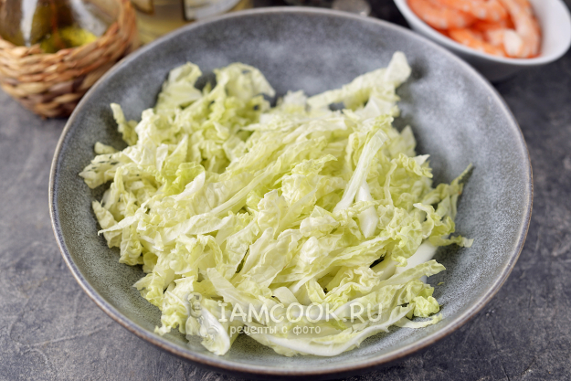 Пекинскую капусту нарежьте соломкой, переложите в удобную миску.