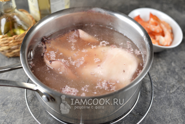 Вскипятите воду в сотейнике, чуть подсолите, положите в нее тушку кальмара, предварительно очищенную от внутренностей и хитиновой пленки. Отварите не дольше минуты. Затем сразу же промойте его под проточной водой от остатков кожи, обсушите бумажными полотенцами. Креветочные хвосты я просто чищу от панциря и кишечника, хотя вареных креветок можно просто обдать кипятком, для собственного спокойствия.