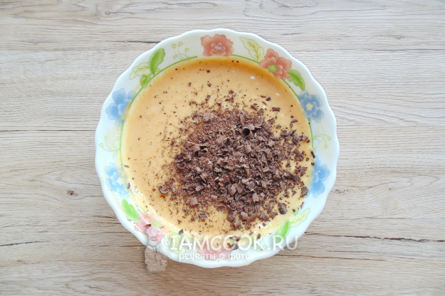 Перемешайте тесто до однородной, гладкой консистенции. Добавьте тертый шоколад. Я это делаю с помощью овощечистки.