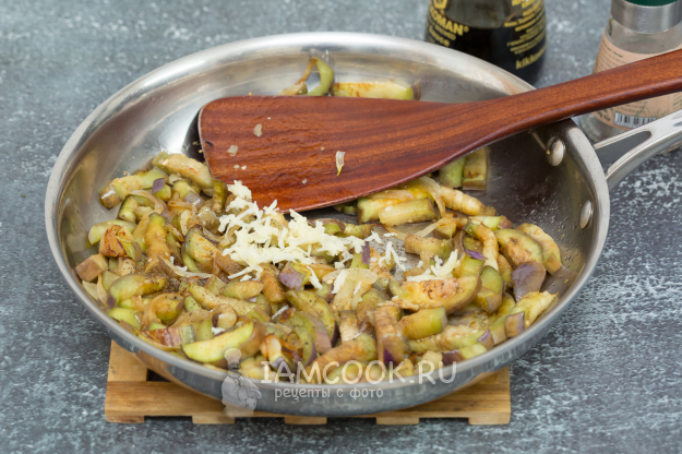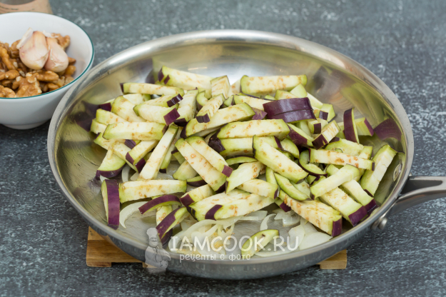 Затем добавьте к луку нарезанные брусочками баклажаны.