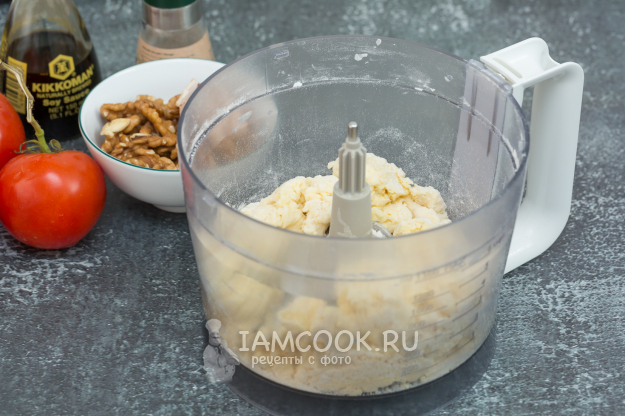 Я загрузила в кухонный комбайн соль, муку и масло. Измельчила. Затем добавила воду и он замесил мне тесто.