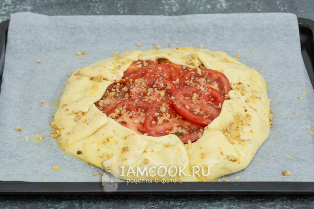 Смажьте тесто взбитым яйцом и присыпьте орехами так, чтобы попали и на помидоры.