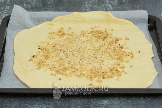 Половину орехов высыпьте на середину круга и равномерно распределите, не доходя до края.
