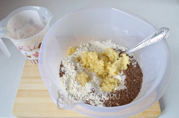 В глубокую миску просеять муку. Добавить готовую остывшую пшенную кашу, дрожжи, соль, сахар и семена льна. Перемешать и постепенно влить теплую воду. Перемешать.