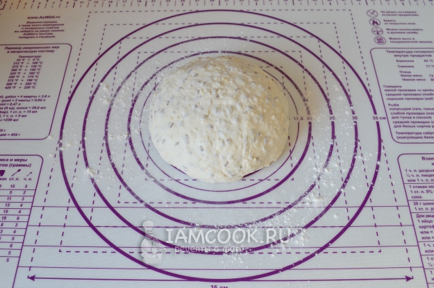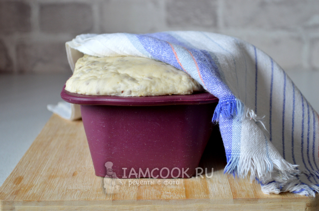 Вымесить тесто в течение 5 минут. Оно получится довольно липким. Рабочую поверхность припылить мукой, выложить тесто. Поверхность теста также припылить мукой, растянуть его в прямоугольник под размер формы.