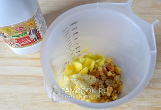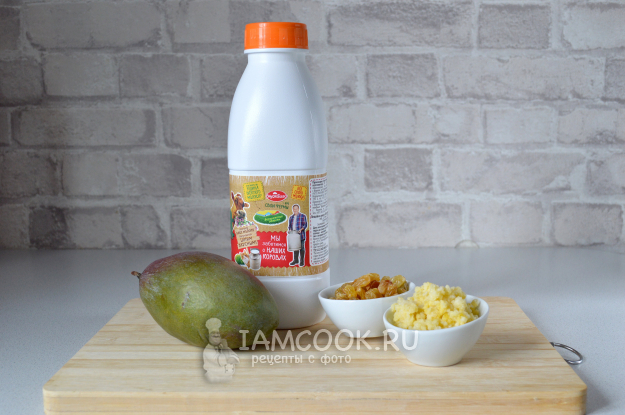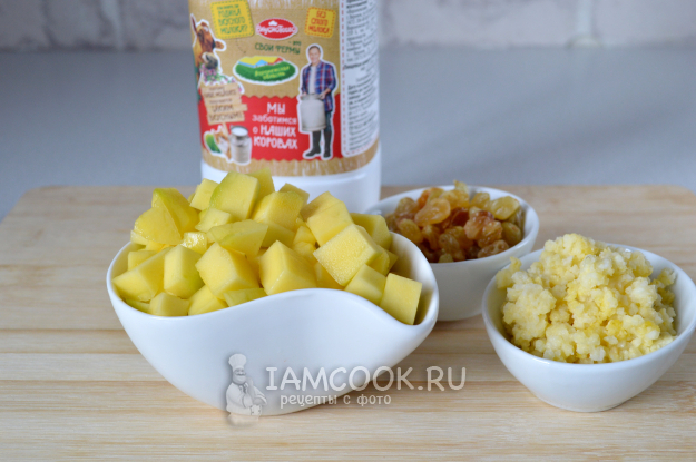 В данном рецепте основной вкусовой нотой выступает манго, в качестве обогащающей добавки - пшенная каша, а для сладости - изюм.