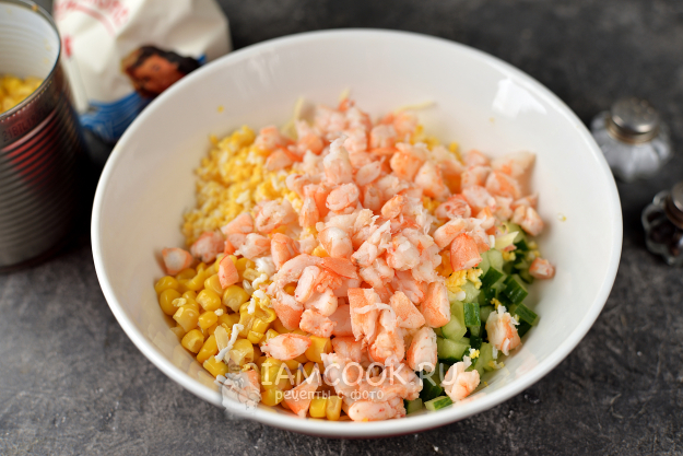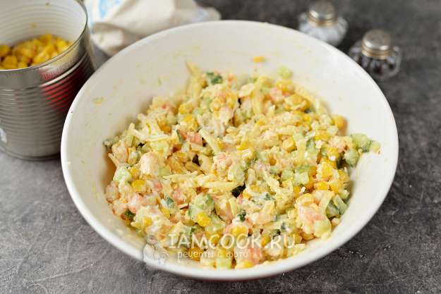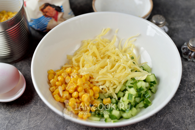 А пока порежьте огурец меленьким кубиком, натрите твердый сыр, переложите их в глубокую миску, добавьте консервированную кукурузу любимого производителя.