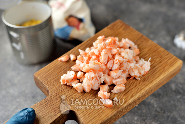 Очистите креветочные хвосты от панциря и кишечника, нарежьте их небольшими кусочками.