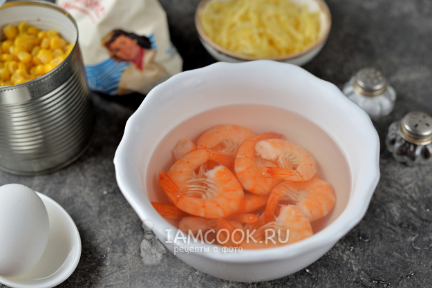 У меня креветки уже сваренные, поэтому я их только заливаю крутым кипятком и держу несколько минут. Если у вас они сырые, тогда отварите их около 3 минут в чуть подсоленной воде.