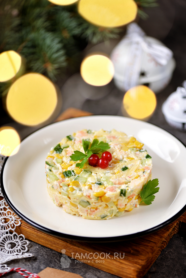 Чтобы салат с креветками, кукурузой и сыром красиво выглядел на праздничном столе, выложите его через сервировочное кольцо, украсьте как вам больше нравится, и можно сразу же подавать.