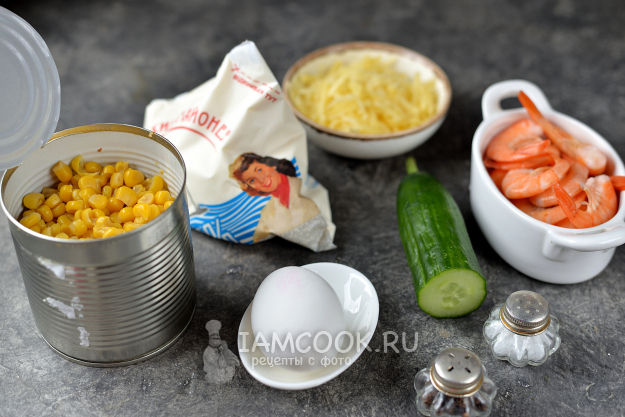 Возьмите всё необходимое для приготовления салата с креветками, кукурузой и сыром. Замороженных креветок разморозьте при комнатной температуре и отварите куриное яйцо не дольше 10 минут. Помойте и обсушите огурец.