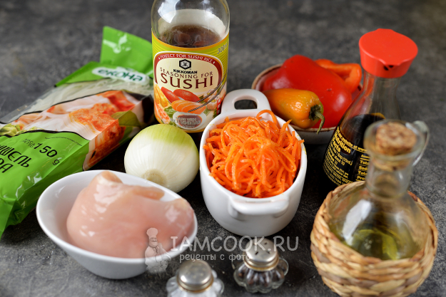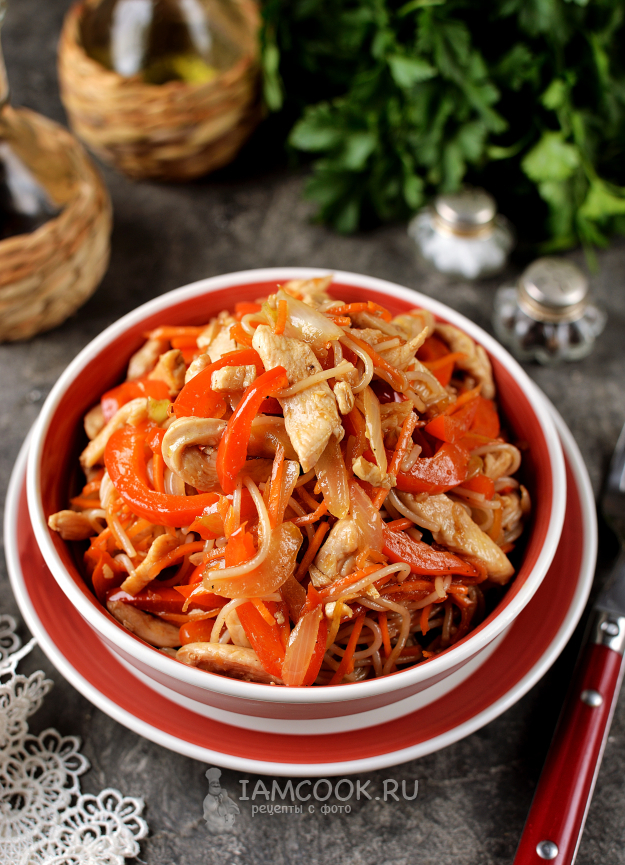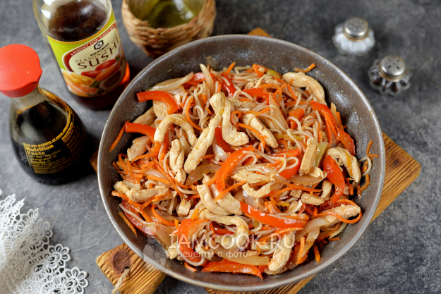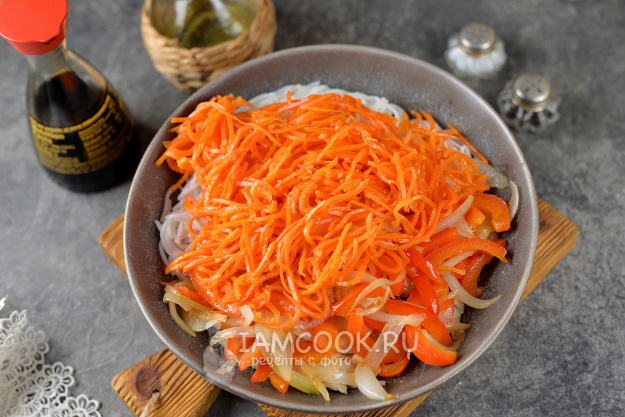 Переложите овощи в миску к курице с вермишелью, добавьте морковь по-корейски, заправьте все соевым соусом, влейте немного рисового уксуса и оливкового масла, чуть поперчите. Уксус вливайте понемногу, поскольку он содержится в моркови по-корейски. Также в моркови содержится достаточно много чеснока, поэтому решайте сами, добавлять еще свежий или нет.