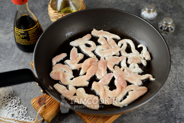 Параллельно поставьте сковороду на плиту, разогрейте в ней масло, обжарьте нарезанное тонкой соломкой куриное филе до слегка румяной корочки.